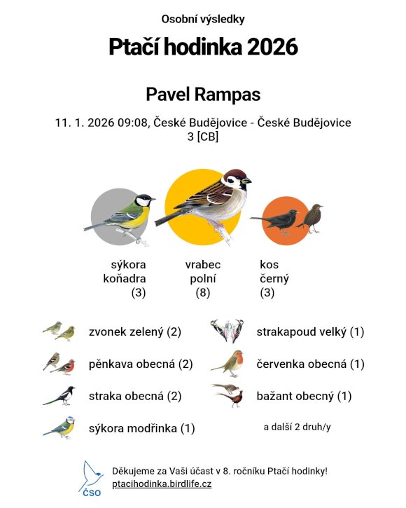 Moje výsledky z letošní ptačí hodinky.